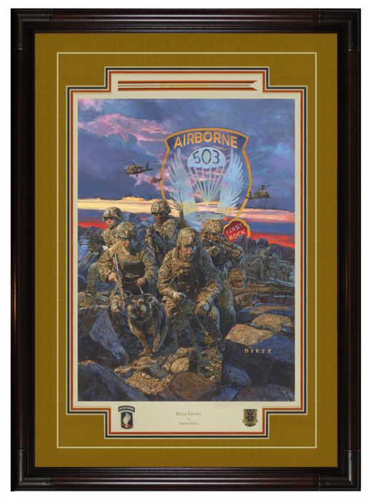 The name of this print, "EAGLE LEGACY," is a testament to the enduring impact TASK FORCE EAGLE has made on the people, communities, and partnered ANSF elements charged with the security of Afghanistan. During three OEF deployments, TASK FORCE EAGLE served in some of the most kinetic, rugged, and austere locations while targeting enemy networks, striking insurgent safe havens, and partnering and enabling ANSF to bring security to the people of Afghanistan. The Eagle Legacy to the Global War on Terrorism was paid with a heavy price as 18 First Rock Paratroopers made the ultimate sacrifice.