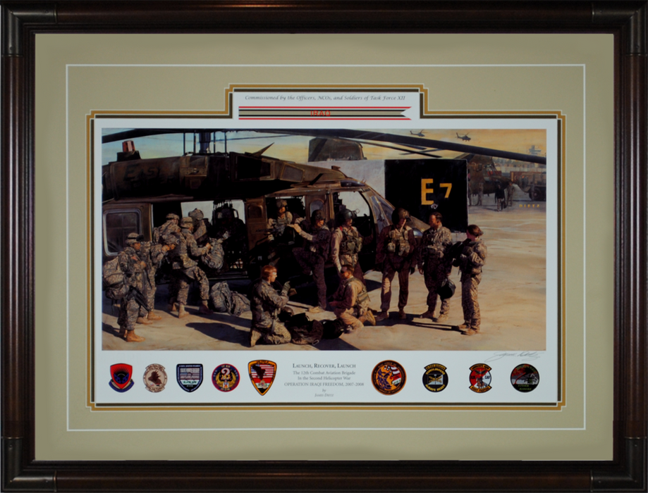 Over the course of their deployment to Iraq, the Soldiers of Task Force XII and Task Force 49 set the standard for aviation support in theater. OIF 07-09 was a key period of transition, as an increase in ground combat forces reduced violence to historic low levels, setting the conditions for political reconciliation. Units at Balad, Taji, BIAP, and Basrah combined to fly more than 110,000 hours, moving more than 272,500 passengers and almost 18 million pounds of cargo, and engaging the enemy on over two hundred separate occasions. Launch, Recover, Launch depicts a routine moment during the brigade’s five hundred days of flying and fighting in Iraq. Along Alpha Taxiway at Balad, a UH-60 "mission set," two Blackhawks and their crews, prepares to launch. The crew members of Chalk One inspect their aircraft, their equipment, and each other to ensure that all is ready. A group of Soldiers load equipment while crew members conduct a final mission briefing. In the background, a CH-47 Chinook stands ready to launch after sunset on a critical resupply or air assault mission. Overhead, a Gunslinger Air Weapons Team leaves Balad on a mission in support of ground forces somewhere in Iraq. Ground support personnel move about the ramp, refueling aircraft and conducting maintenance services. This seemingly mundane but incredibly complex scene encapsulates the daily contributions of over four thousand Soldiers, of all ranks and occupational specialties, to the incredible achievements of Task Force XII and Task Force 49.