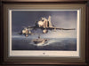 Into the Storm depicts two Phantoms passing the USS Constellation on a MiGCAP mission, armed with Sparrow and Sidewinders in 1967. Two stalwart squadrons are represented here; VF-143’s “Pukin’ Dogs” and VF-142’s “Ghostriders”, who flew together as sister squadrons throughout the war.