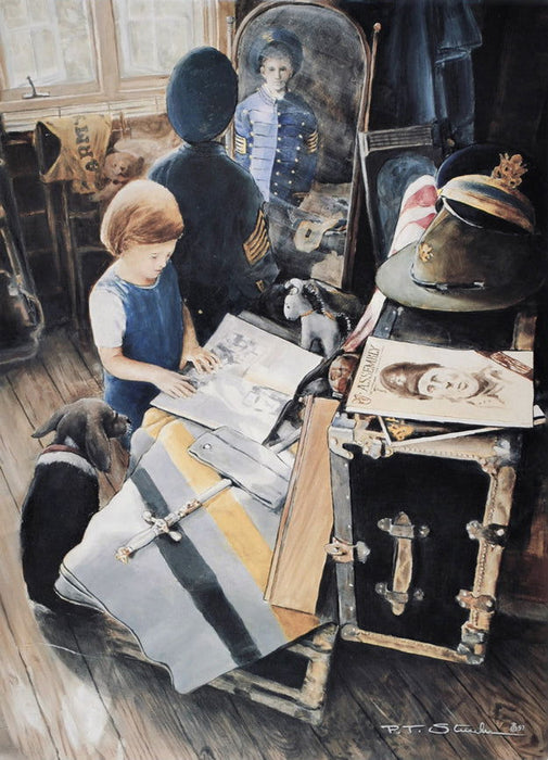 "Treasures from the past reveal the history of those who defended freedom and served their nation. They are inspiring reminders that become beacons for the future. Such moments can set the course for a lifetime of leadership - duty, honor, country. Samantha Shepard, age 6, reviews an old copy of the Military Academy yearbook while Philip Bradford, age 6, dreams about marching across the plain. Cassie (Albina) the beagle thinks it is all pretty dull as there are no pictures of dogs. This particular attic full of reminders is at Lee Road on the U.S. Army Military Academy at West Point, N.Y. I am indebted to the West Point Women's Club for suggesting the theme and for providing the models and the mementos that became hidden treasures. I appreciate the generous use of Cindy and Lt. Col. Donald Endgen's attic, and the generous loan of artifacts provided by numerous members of the Women's club. Samantha's mother, Jennie, and Phillip's mother, Anne, were instrumental in the coaching of the models. When all else fails use a chocolate drop."