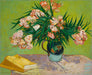 For Van Gogh, oleanders were joyous, life-affirming flowers that bloomed "inexhaustibly" and were always "putting out strong new shoots." In this painting of August 1888 the flowers fill a majolica jug that the artist used for other still lifes made in Arles. They are symbolically juxtaposed with Émile Zola's La joie de vivre, a novel that Van Gogh had placed in contrast to an open Bible in a Nuenen still life of 1885.