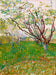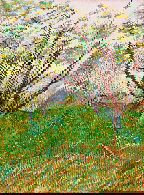 The arrival of spring in Arles in 1888 found Van Gogh "in a fury of work." As he wrote to his brother Theo, "the trees are in blossom and I would like to do a Provençal orchard of tremendous gaiety." Between late March and late April, the artist dedicated fourteen canvases to the subject, working in a range of sizes, formats, and styles. This composition, dominated by the angular, elongated branches of the budding trees, attests to Van Gogh’s admiration for Japanese prints. His inclusion of the scythe and rake makes this one of only two orchard paintings to hint at a human presence.