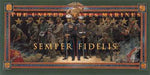 The inscriptions around the border of the painting are those slogans by which the Marine Corps has been known throughout its storied history.